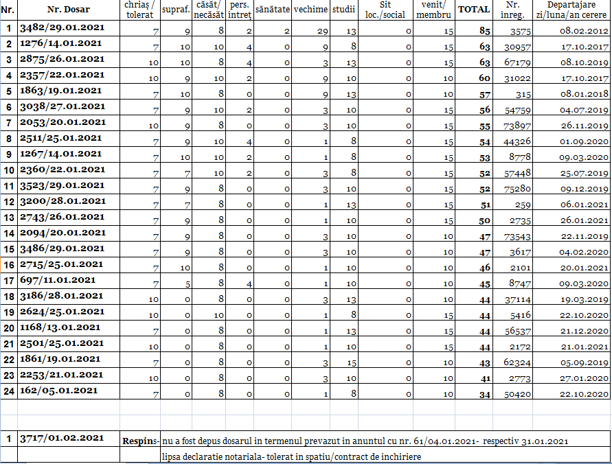 Un dosar a fost respins, pentru că nu a fost depus până la data de 31 ianuarie 2021, termen prevăzut în anunțul publicat în 4 ianuarie, respectiv din cauza lipsei declarației notariale – tolerat în spațiu/contract de închiriere.