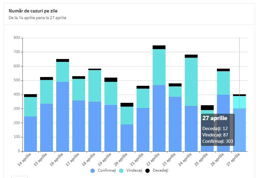 11.339 de cazuri de persoane infectate cu noul coronavirus au fost confirmate pe teritoriul României până luni, 27 aprilie. La nivel național, au fost prelucrate 143.834 de teste.