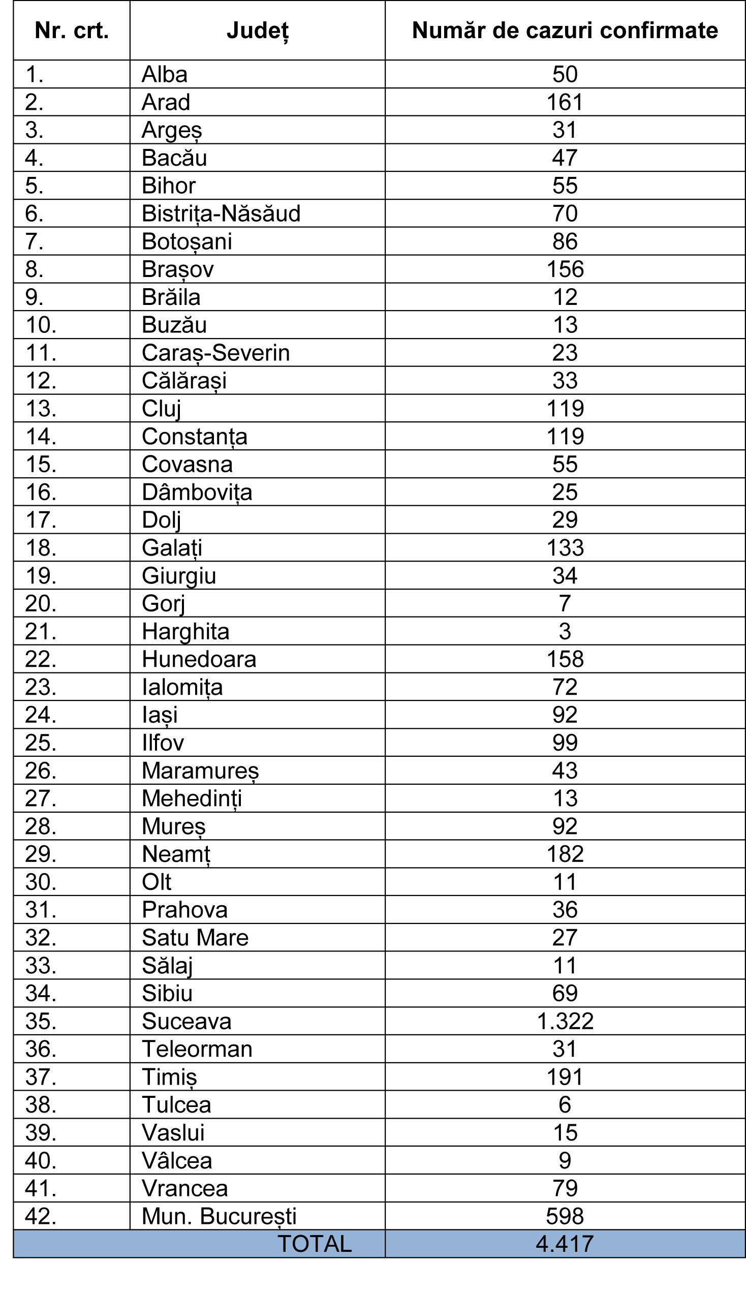 Numărul de cazuri confirmate, pe județe, potrivit raportării Institutului Național de Sănătate Publică: