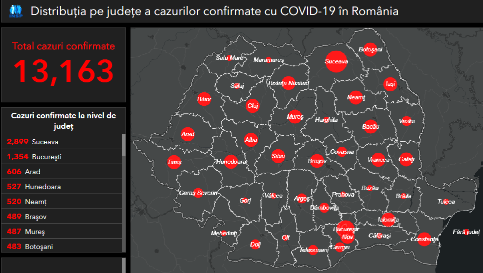 Până duminică, 3 mai, pe teritoriul României, au fost confirmate 13.163 de cazuri de persoane infectate cu noul coronavirus. La nivel național, au fost prelucrate 195.508 de teste.