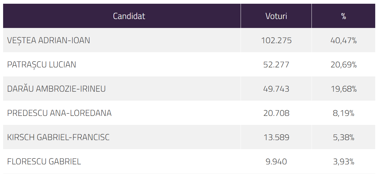 Lucian Pătrașcu de la PSD a primit 20,69% dintre voturi, în timp ce Ambrozie-Irineu Darău de la Alianța Dreapta Unită are 19,68%.