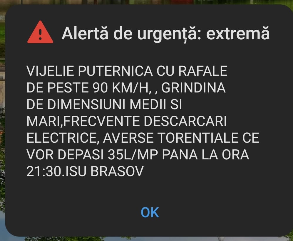 ISU Brașov a trimis, prin RO-ALERT, o atenționare pe telefoanele locuitorilor.