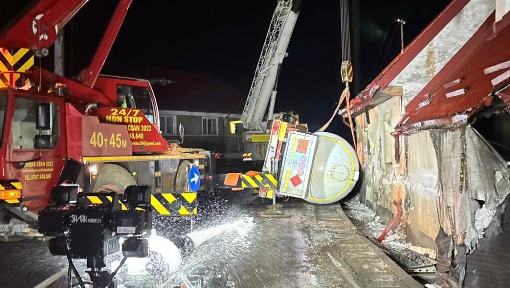 Autocisterna care transporta gaz butan și care s-a răsturnat luni noaptea pe DN 1, în localitatea Scoreiu, județul Sibiu, a fost ridicată de pe partea carosabilă cu ajutorul a două macarale, fără a fi înregistrate incidente pe durata intervenției. Șoferul a fost sancționat contravențional cu 3.037 lei.