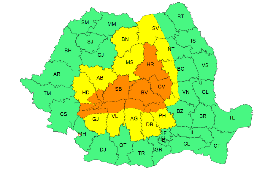 Atenționarea de cod portocaliu vizează județele Sibiu, Brașov, Covasna, Harghita, precum și zonele montane din județele Gorj, Hunedoara, Alba, Vâlcea, Argeș, Dâmbovița și Prahova.