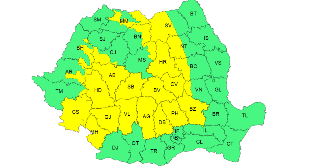 Administrația Națională de Meteorologie (ANM) și Institutul Național de Hidrologie și Gospodărire a Apelor (INHGA) au emis marți atenționări de tip Cod galben privind fenomene meteorologice și hidrologice periculoase, valabile în cursul zilei de marți și în noaptea de marți spre miercuri.