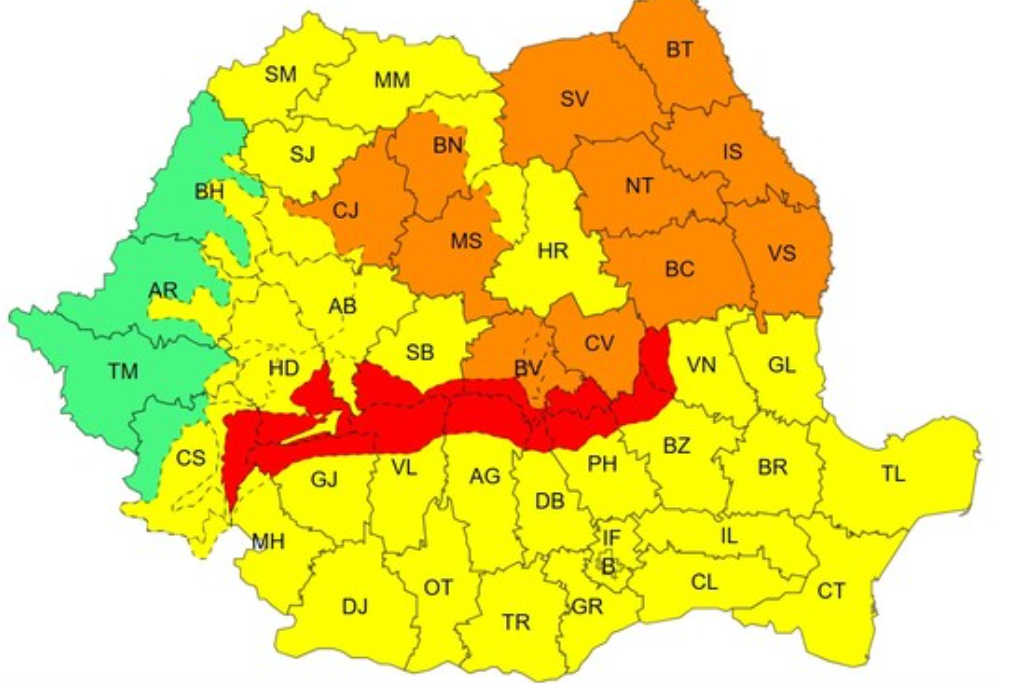 În același timp, o avertizare cod portocaliu este valabilă în intervalul 28 decembrie, ora 10 – 29 decembrie, ora 02, vizând în special Moldova și local Transilvania. Potrivit ANM, vântul va sufla cu rafale de 70–90 km/h, va ninge viscolit, iar vizibilitatea va fi foarte redusă. În Carpații Meridionali și în nordul și centrul Carpaților Orientali, la altitudini de peste 1.700 de metri, rafalele pot ajunge la 90–100 km/h.