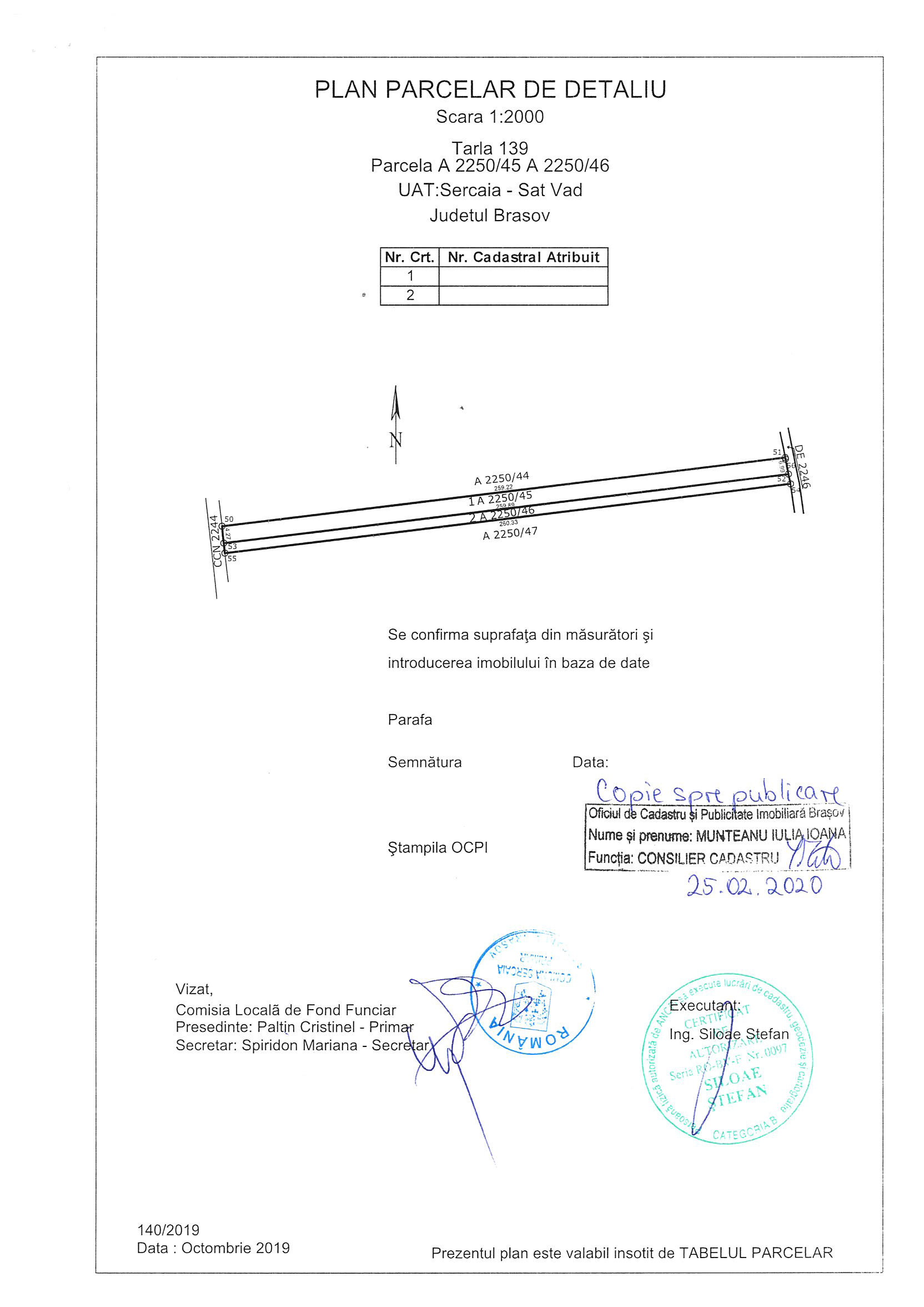 În conformitate cu prevederile Legii nr. 7/1996, art. 40, alin. 7 la 12, Legea cadastrului, se afișează Planul parcelar și tabelul parcelar al T. 139 parcela A 2250/45 , A 2250/46 ,din UAT Șercaia, recepționate de către OCPI Brașov.