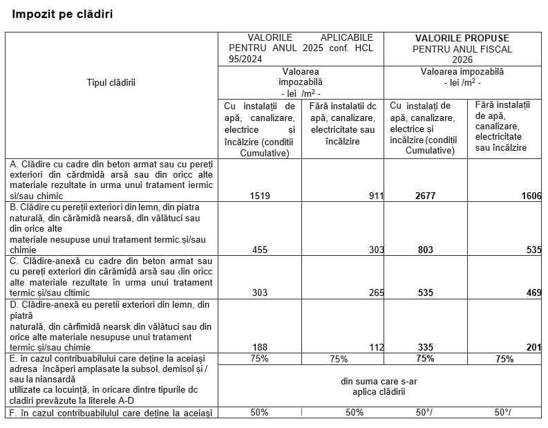 Pentru anul fiscal 2026, stabilirea impozitelor și taxelor locale se realizează în conformitate cu art. 491 din Codul fiscal, fiind exceptate de la indexare, potrivit prevederilor legale, următoarele categorii: