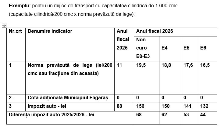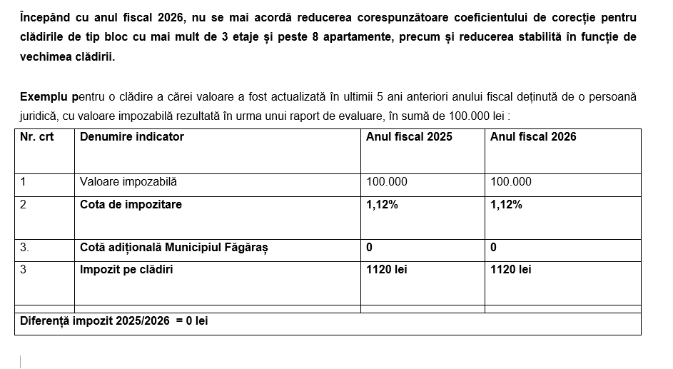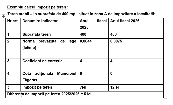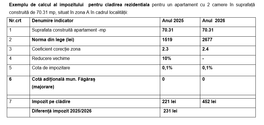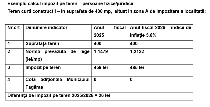 Primăria Municipiului Făgăraș informează cetățenii că, pentru anul fiscal 2026, nivelurile impozitelor și taxelor locale au fost stabilite strict în limitele prevăzute de legislația fiscală în vigoare, fără aplicarea unor majorări sau cote adiționale la nivel local.