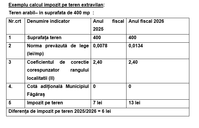 Impozitul se stabilește prin înmulțirea suprafeței terenului, exprimată în hectare, cu sumele corespunzătoare prevăzute în tabele. Pentru anul 2026, aceste sume au fost indexate cu rata inflației de 5,6%, conform prevederilor legale.