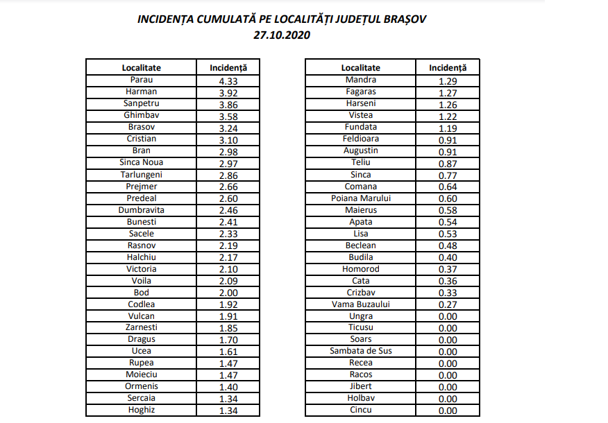 La nivelul județului Brașov, marți, 27 octombrie, incidența COVID-19 este de 2,45 la o populație totală de 650.617 de locuitori.