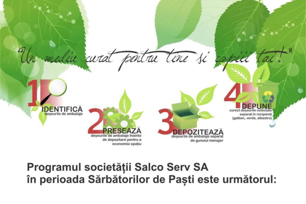 Firma de salubritate Salco Serv SA anunță că programul de ridicare a deșeurilor reziduale nu va suferi modificări în perioada Paștelui.