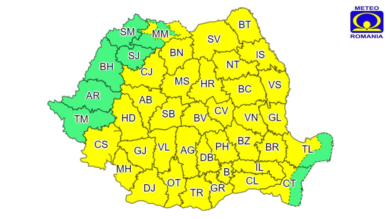Meteorologii au emis un cod galben de instabilitate atmosferică accentuată, valabil de vineri, 17 iunie până sâmbătă, 18 iunie, ora 06:00.