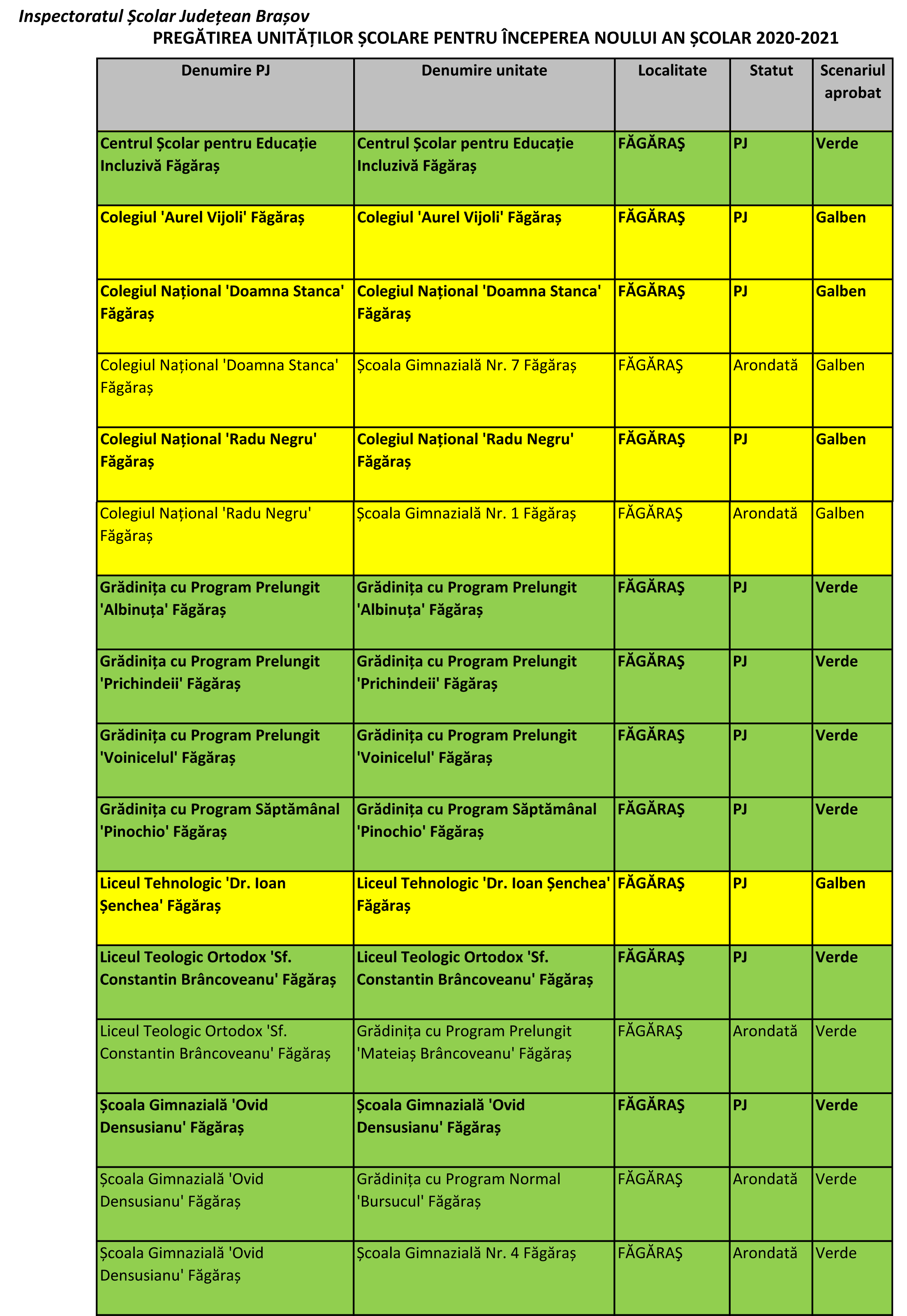 Detalii despre scenariile aprobate pentru toate școlile și grădinițele din județ se găsesc aici: Hotărârea IȘJ Brașov