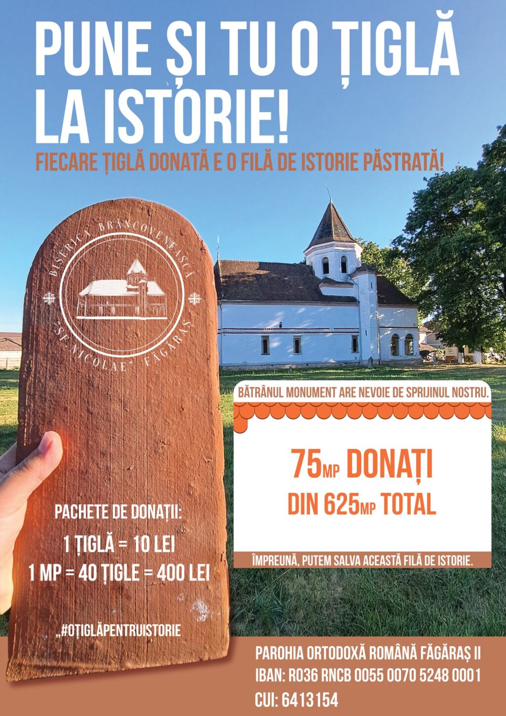 Costurile sunt prezentate transparent: o țiglă costă 10 lei, iar un metru pătrat de acoperiș presupune 40 de țigle, adică 400 de lei. Donațiile pot fi făcute direct în contul parohiei: