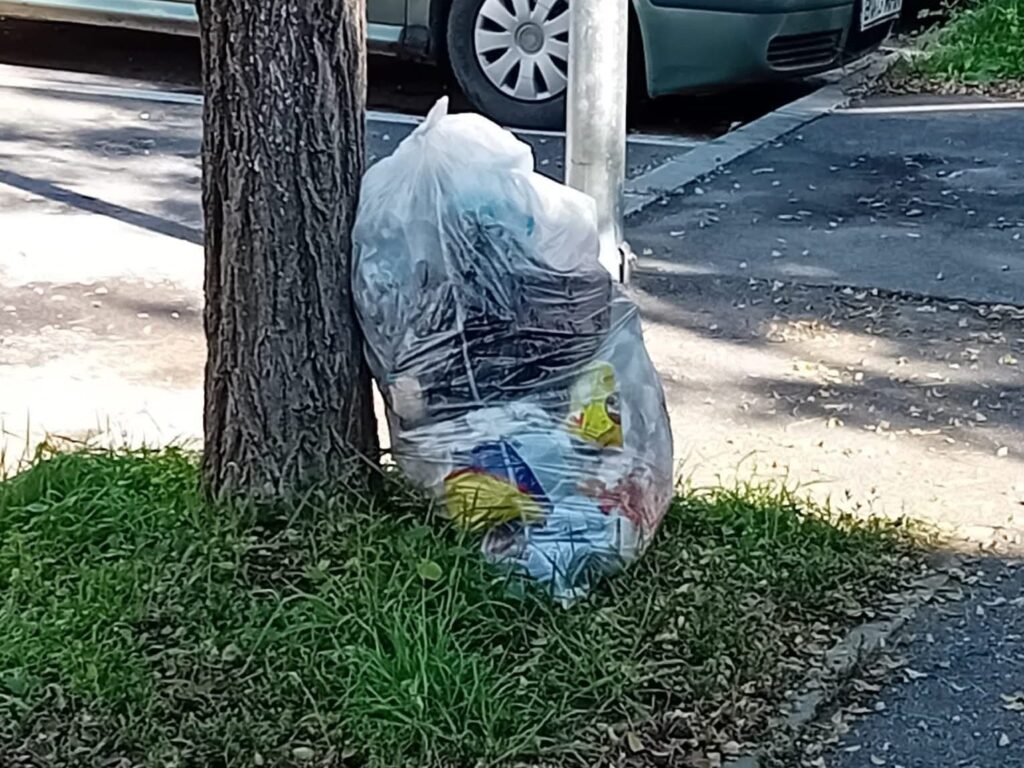 O localnică a postat pe Facebook o fotografie în care se poate observa cum un sac de gunoi a fost rezemat de un copac, pe strada Câmpului.
