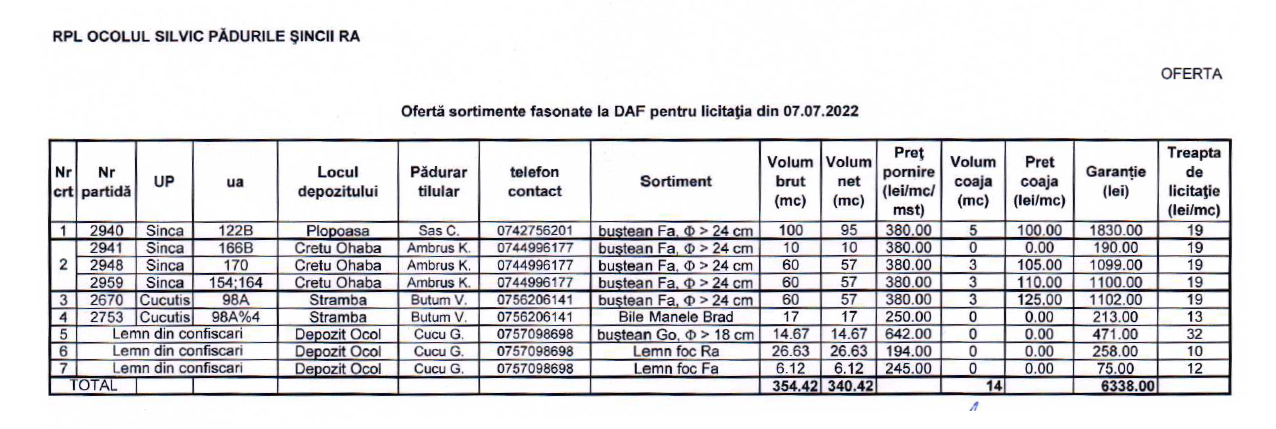 Volumul total de masă lemnoasă fasonată oferit la licitație 354,42 m3, din care pe sortimente: