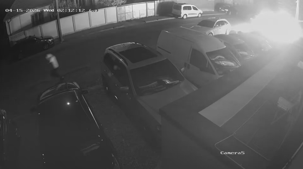 În același timp, imagini surprinse de camerele de supraveghere din zonă arată clar cum o persoană se apropie de autoturism, îl stropește cu benzină, îl incendiază, după care fuge.