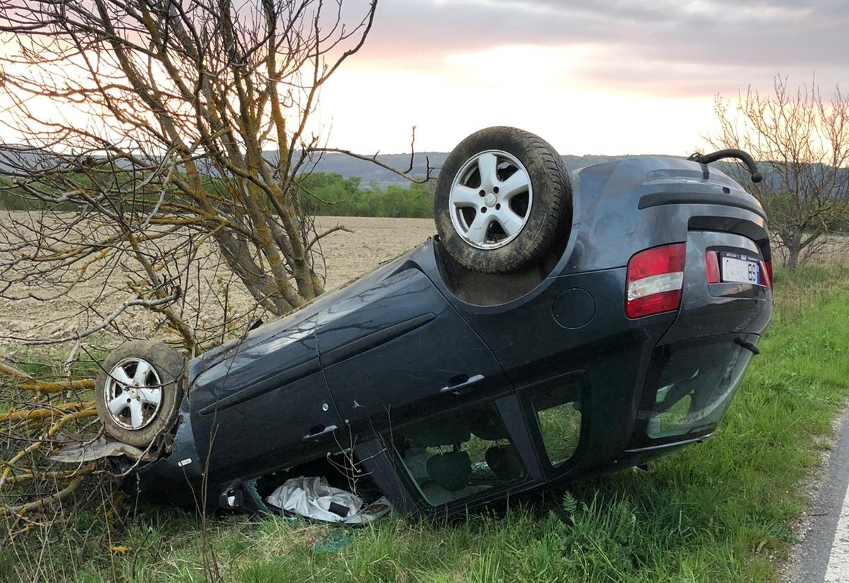 Un autoturism înmatriculat în Sibiu a ajuns cu roțile în sus, duminică, 26 aprilie, pe drumul spre Sâmbăta de Sus.
