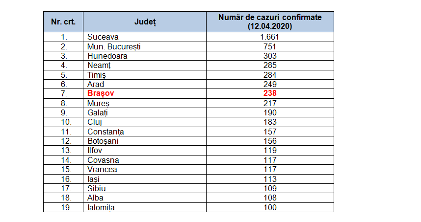Grupul de Comunicare Strategică a anunțat duminică, 12 aprilie, existența a 238 de cazuri de infectare cu SARS-CoV-2 în județul Brașov, dar și al cincilea deces provocat de virusul ucigaș.