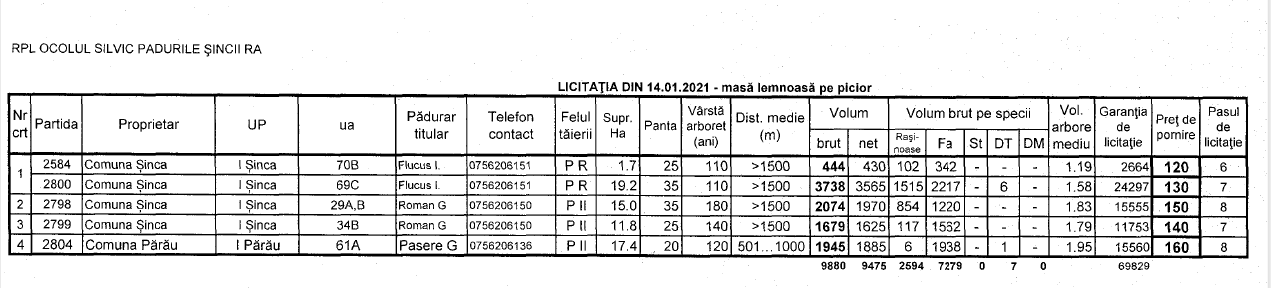 Regia Publică Locală Ocolul Silvic Pădurile Șincii RA anunță organizarea licitației în data de 14 ianuarie 2021, ora 12, la sediul RPL OS Pădurile Șincii RA, str. Principală nr. 16, Șercaia, jud. Brașov.