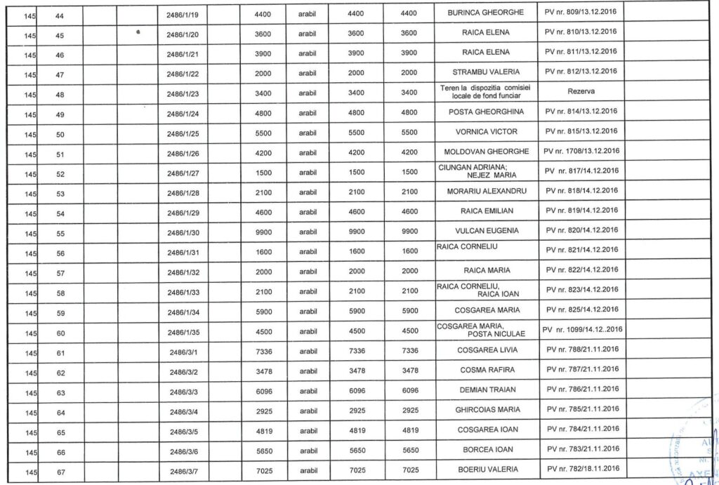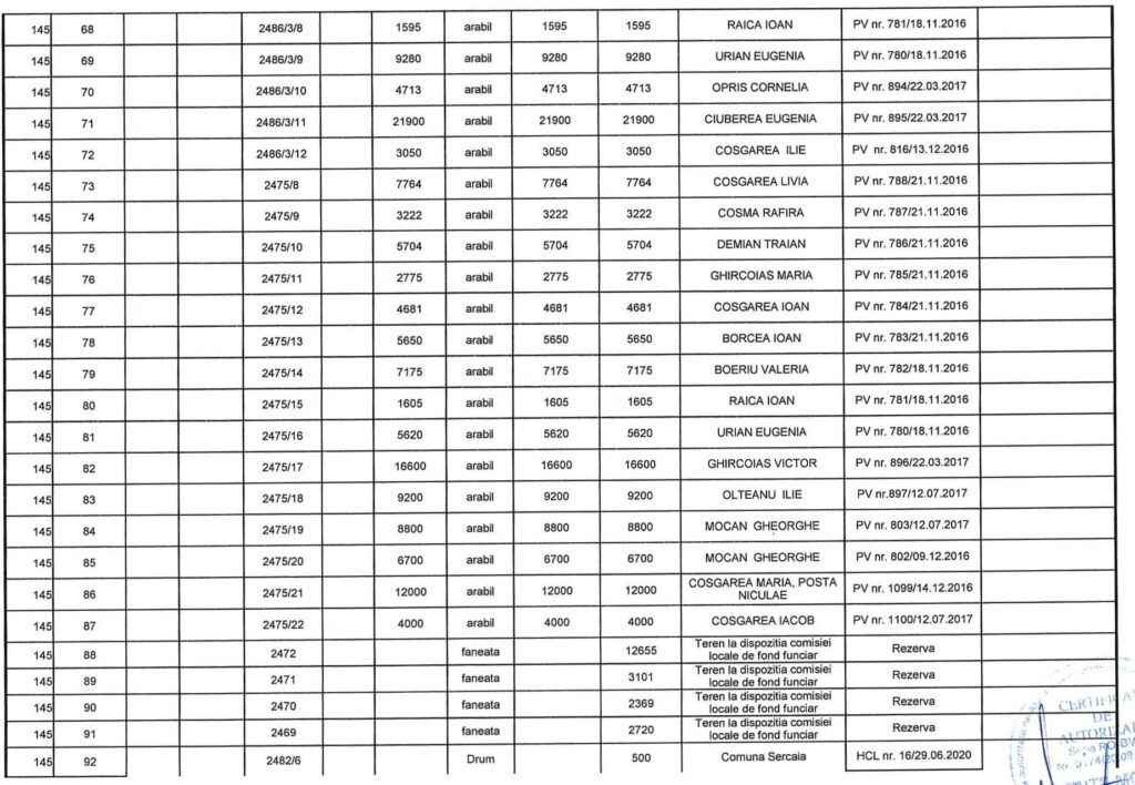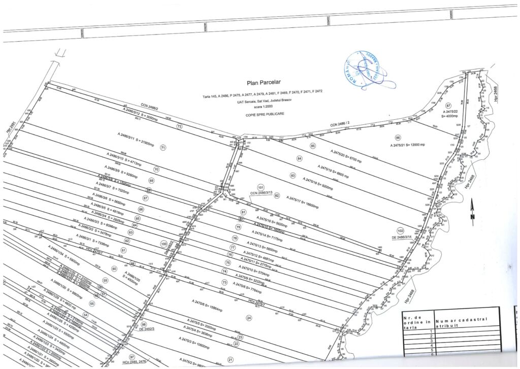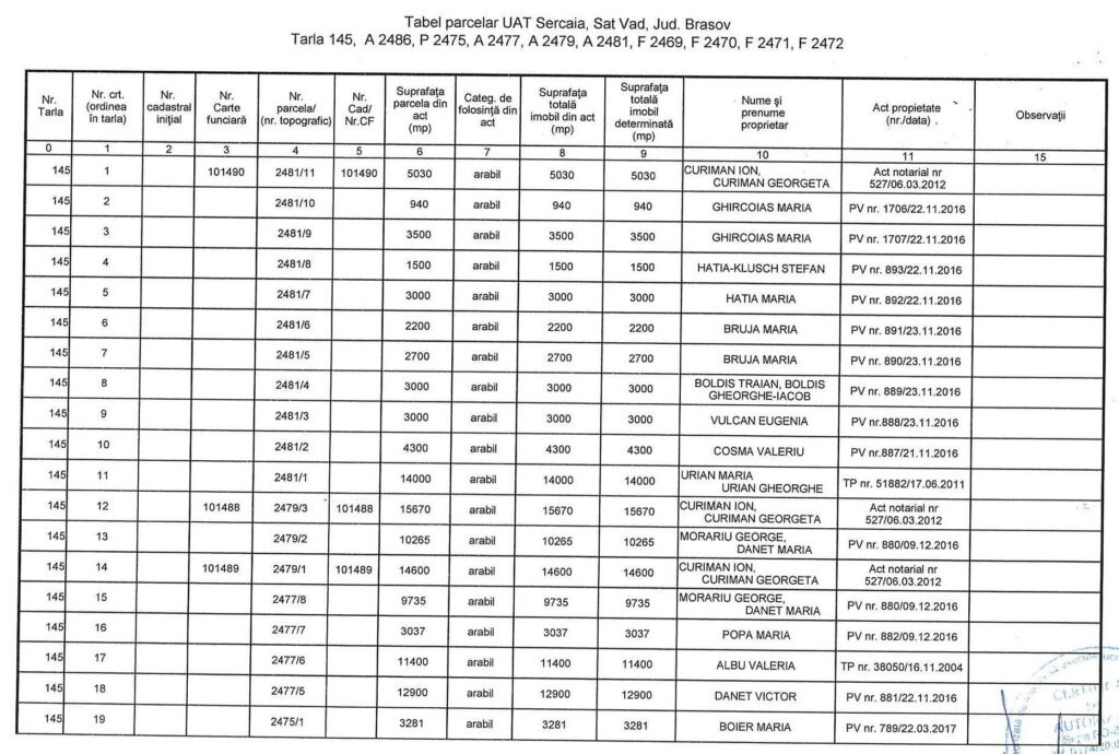 În conformitate cu prevederile Legii nr. 7/1996, art. 40, alin. 7 la 12, Legea cadastrului, se afișează Planul parcelar și tabelul parcelar al T 145 parcela A 2486, P 2475, A 2477, A 2479, A 2481, F 2469, F 2470, F 2471, F 2472 din UAT Șercaia, recepționate de către OCPI Brașov.