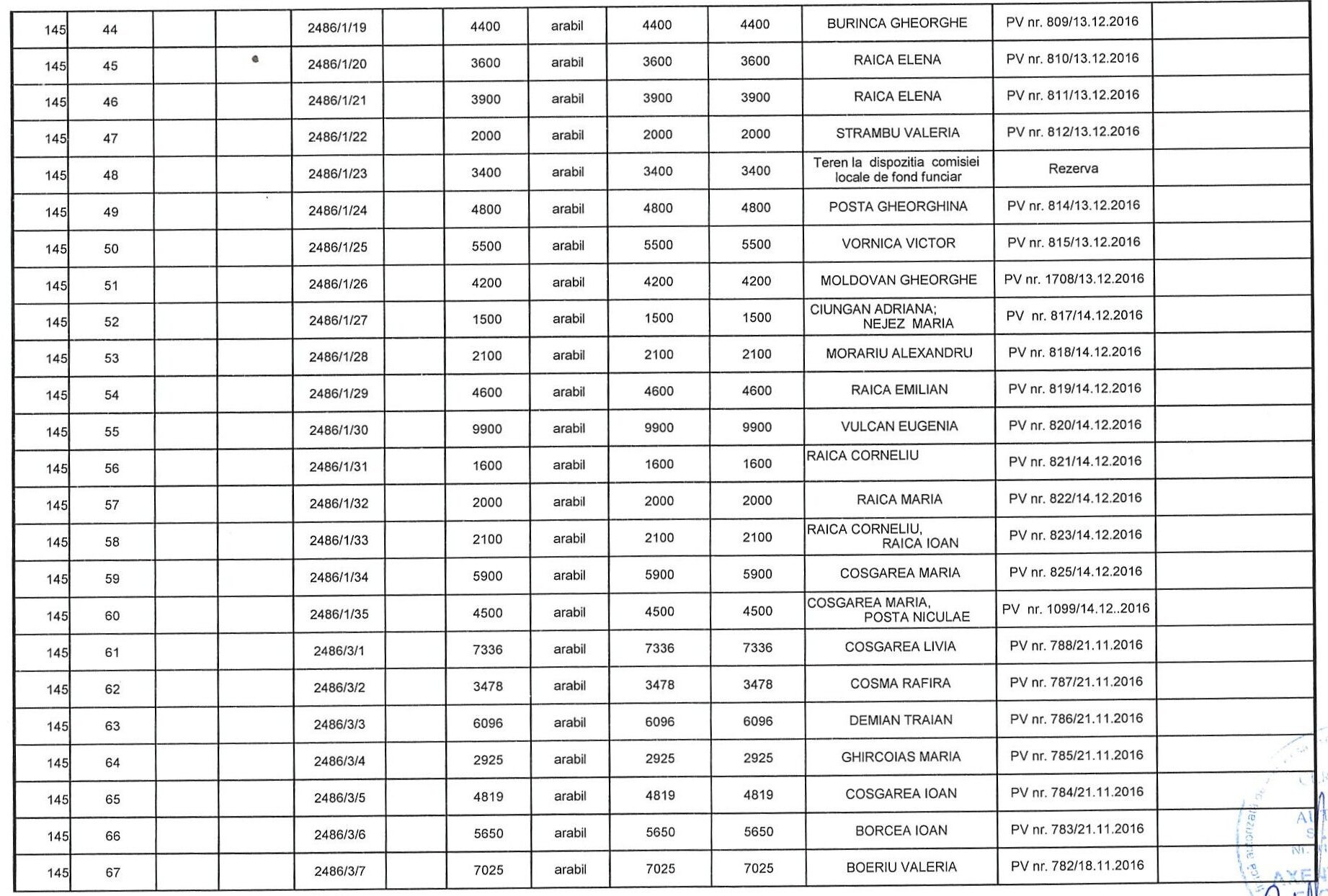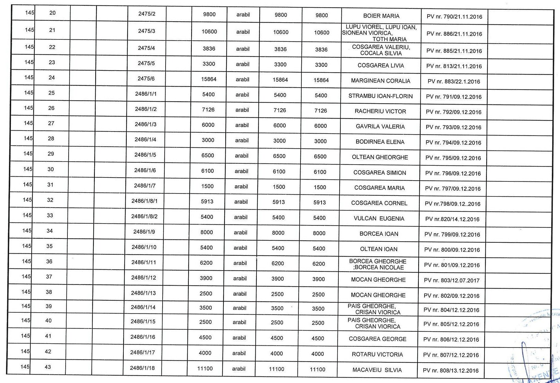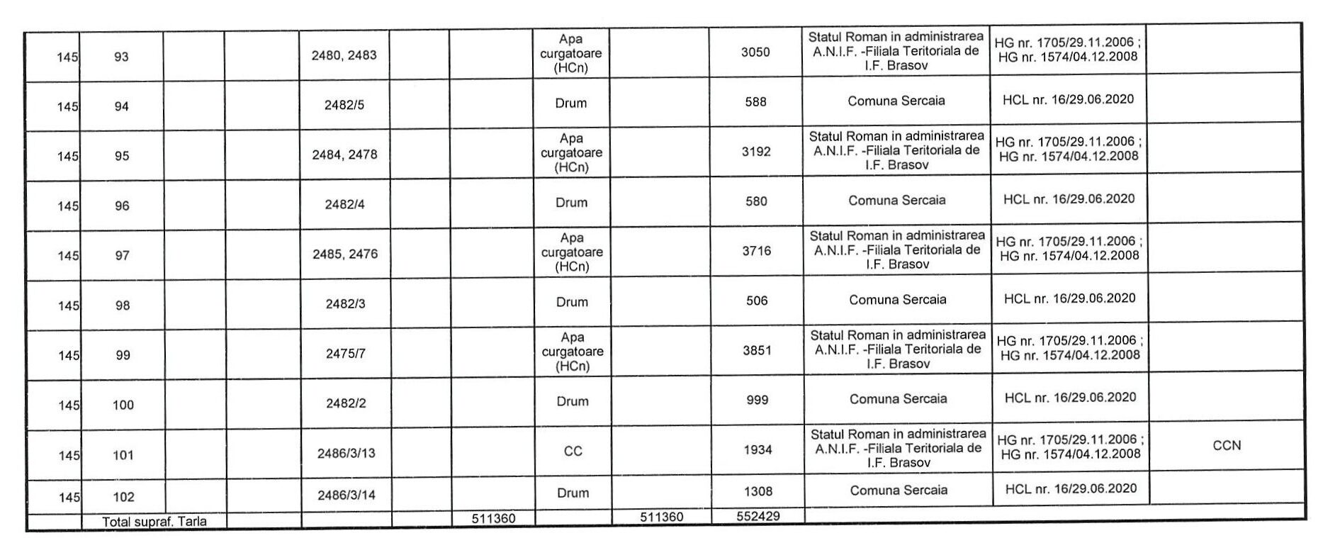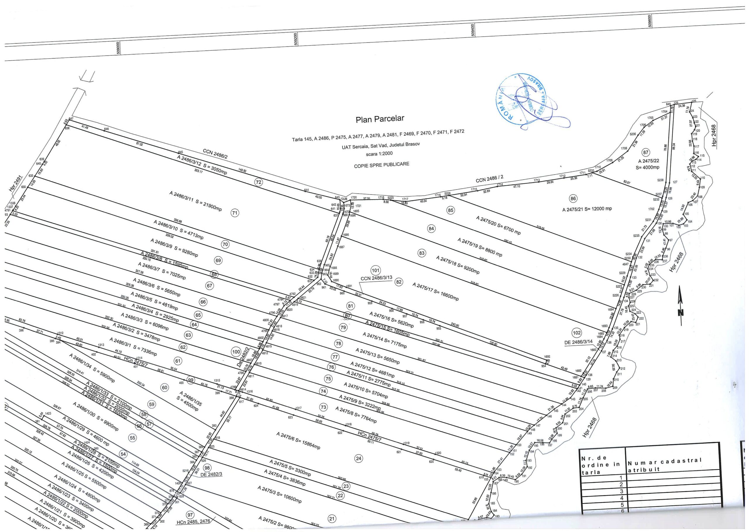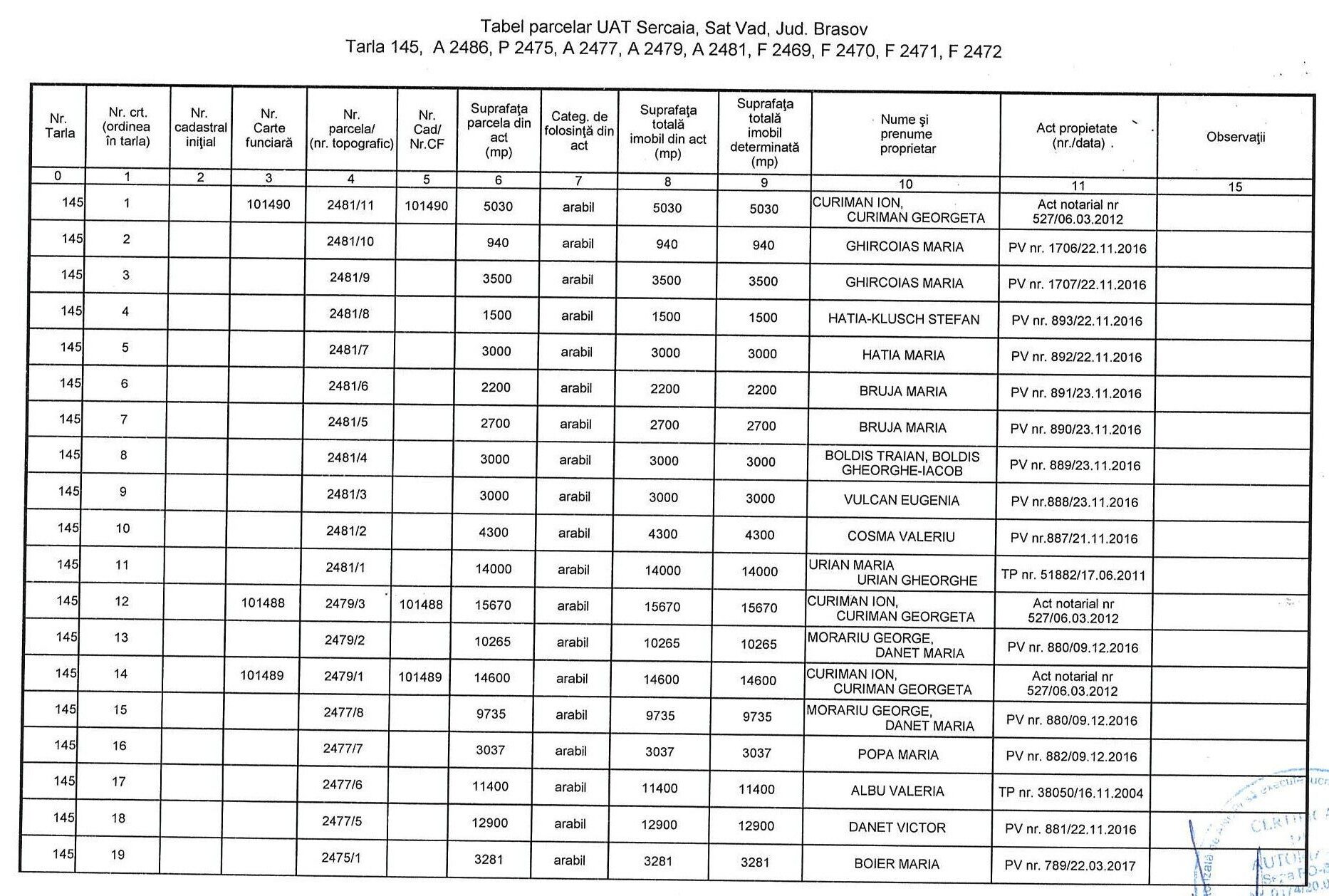 În conformitate cu prevederile Legii nr. 7/1996, art. 40, alin. 7 la 12, Legea cadastrului, se afișează Planul parcelar și tabelul parcelar al T 145 parcela A 2486, P 2475, A 2477, A 2479, A 2481, F 2469, F 2470, F 2471, F 2472 din UAT Șercaia, recepționate de către OCPI Brașov.