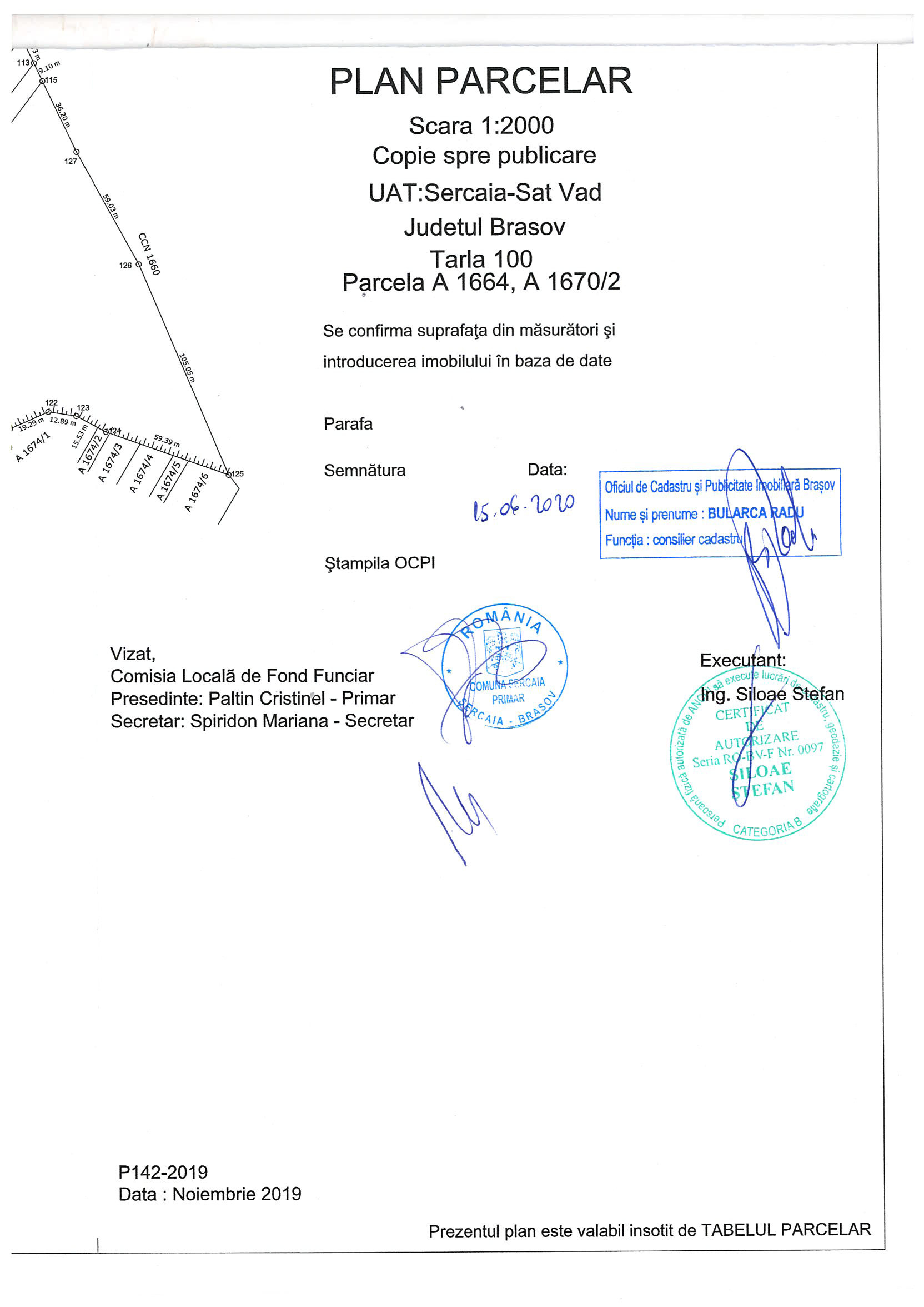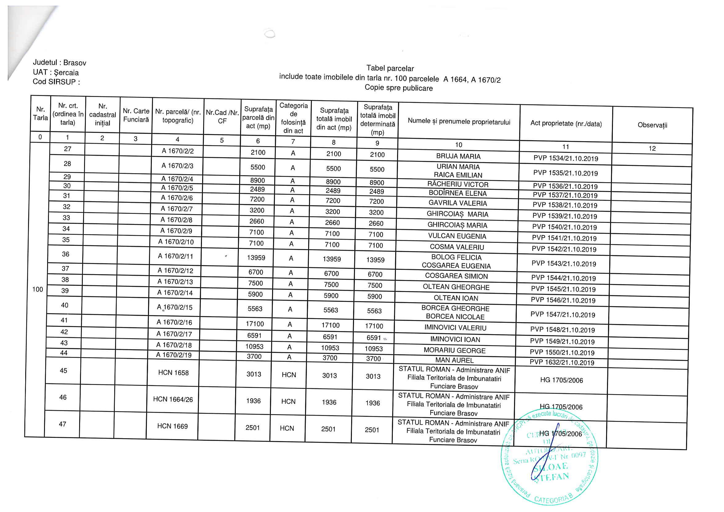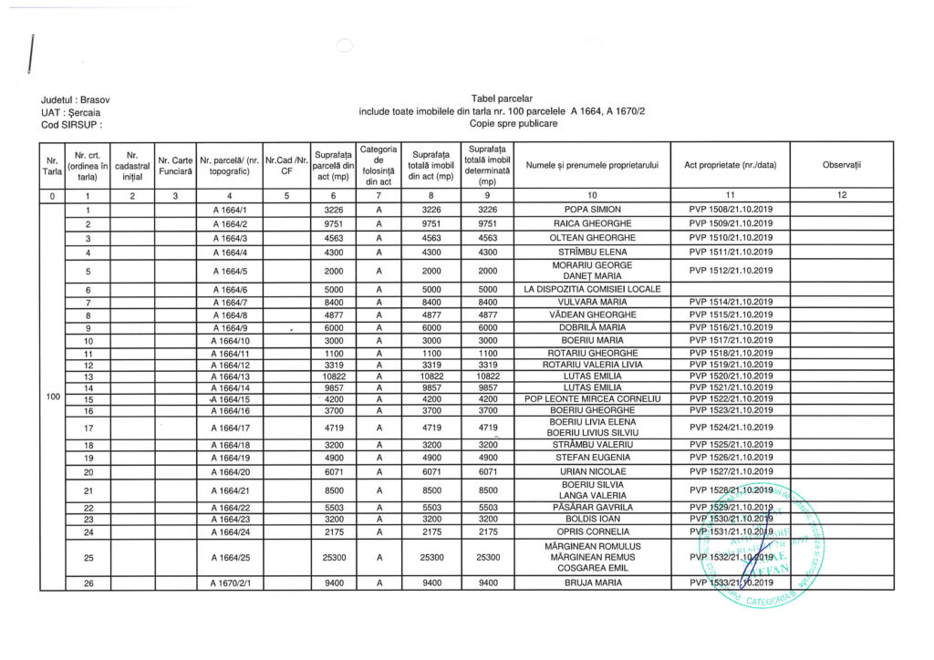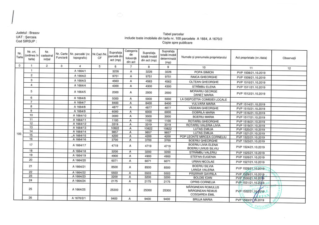 În conformitate cu prevederile Legii nr. 7/1996, art. 40, alin. 7 la 12, Legea cadastrului, se afișează Planul parcelar și tabelul parcelar al T. 100 parcela A 1664, A 1670/2 din UAT Șercaia, recepționate de către OCPI Brașov.