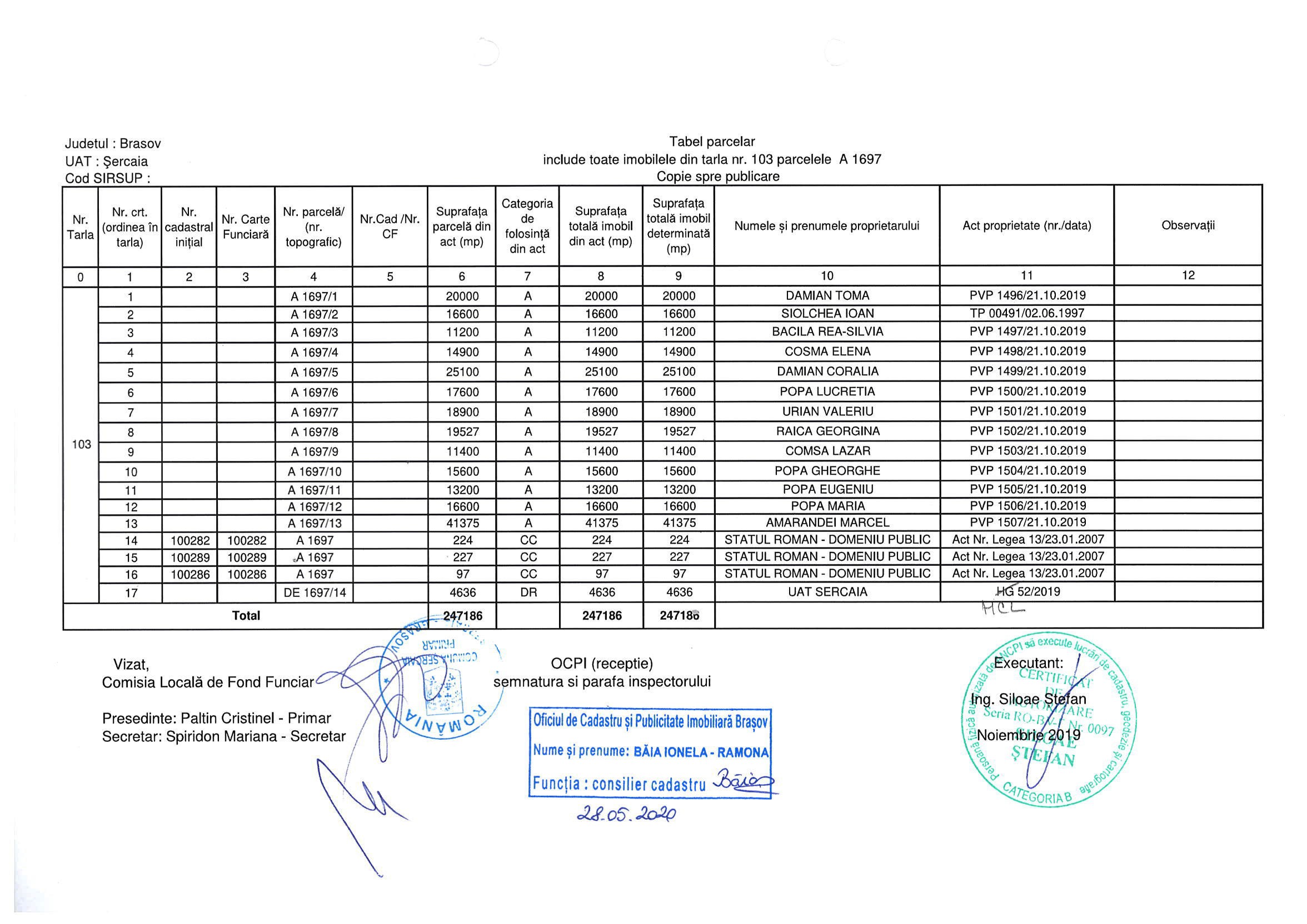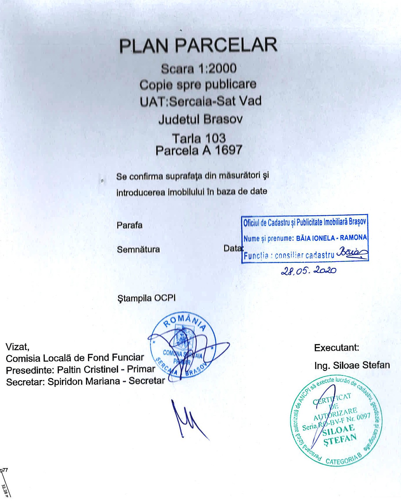 În conformitate cu prevederile Legii nr. 7/1996, art. 40, alin. 7 la 12, Legea cadastrului, se afișează Planul parcelar și tabelul parcelar al T. 103 parcela A 1697 din UAT Șercaia, recepționate de către OCPI Brașov.