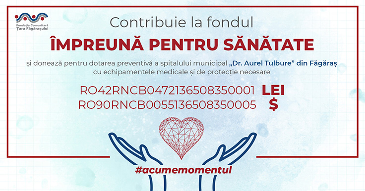 Fundația Comunitară Țara Făgărașului (FCTF) a lansat apelul de donații pentru fondul „Împreună pentru sănătate (COVID-19)”, ce își propune să atragă resurse financiare care urmează a fi rapid direcționate către achiziționarea necesarului de echipamente medicale și de protecție pentru angajații Spitalului Municipal „Dr. Aurel Tulbure“ din Făgăraș, în contextul actual al înmulțirii cazurilor de îmbolnăviri cu virusul COVID-19 pe tot teritoriul României.