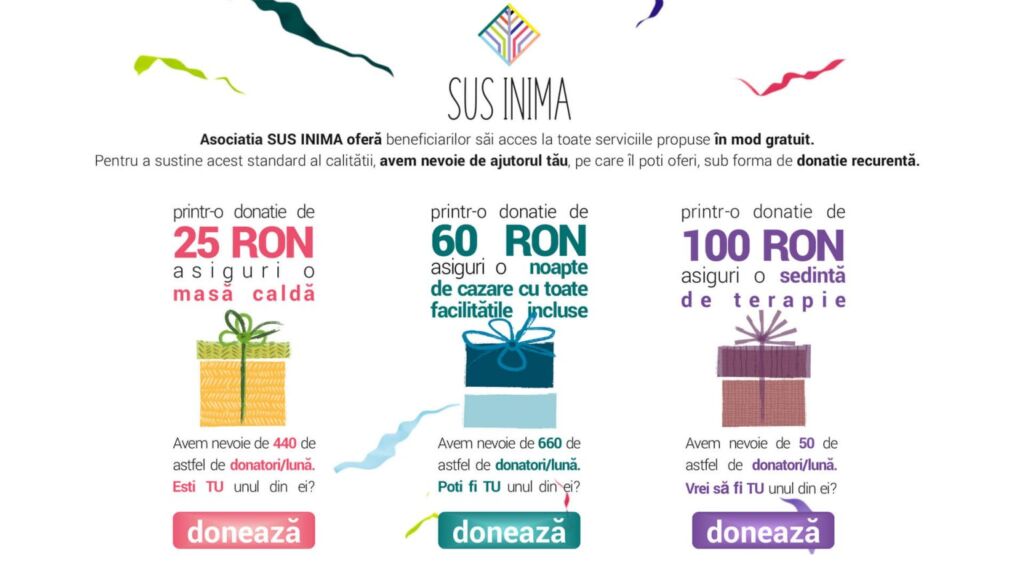 „Avem nevoie de oameni cu #inimasus. Mai precis, 1.150 de oameni care să ne ajute lunar, până la sfârșitul anului. Astfel, dacă găsim 440 de donatori lunari a câte 25 lei, 660 de donatori lunari a 60 lei și 50 de donatori lunari a 100 lei, Asociația Sus Inima poate oferi mese, cazare și ședințe de terapie pentru persoanele afectate de cancer până la sfârșitul lui 2021. Avem nevoie de tine! Alătură-te campaniei noastre, pentru ca nimeni să nu treacă singur prin cancer!” este mesajul asociației.