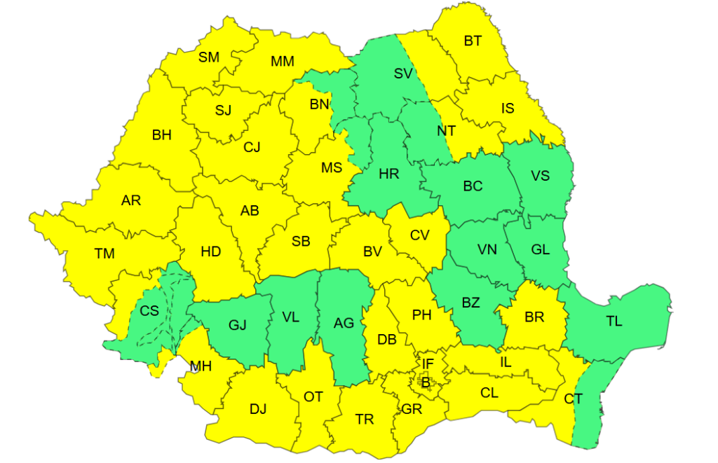 O a doua avertizare Cod galben va fi în vigoare vineri, 6 septembrie, între orele 12.00 şi 21.00, pentru judeţele Satu Mare, Maramureş, Bistriţa-Năsăud, Suceava, Mureş, Cluj, Sălaj, Bihor, Arad, Timiş, Caraş-Severin, Hunedoara, Alba şi Sibiu.