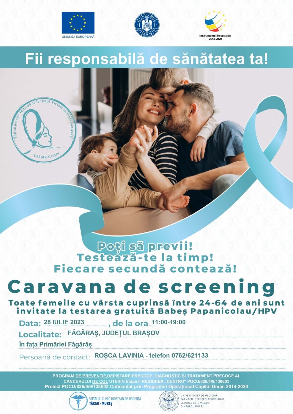 Proiectul „Program de prevenție, depistare precoce și tratament precoce al cancerului de col uterin, regiunea Centru” (cod SMIS 138603) este derulat de către Spitalul Clinic Județean de Urgență Târgu Mureș în calitate de beneficiar, în parteneriat cu Universitatea de Medicină, Farmacie, Științe și Tehnologie „George Emil Palade” din Târgu Mureș şi are ca obiectiv creșterea accesului la servicii accesibile, durabile și de înaltă calitate, prin organizarea de programe de sănătate si servicii orientate către prevenție, depistare precoce (screening) diagnostic și tratament precoce al cancerului de col uterin.