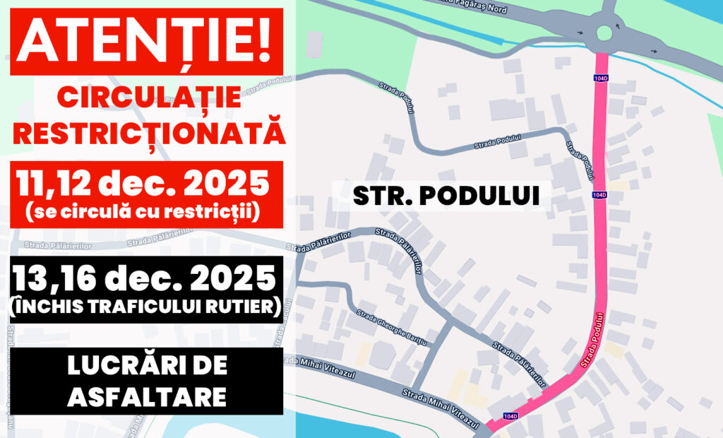Traficul rutier pe strada Podului din Făgăraș va fi afectat în perioada 11–16 decembrie 2025, ca urmare a unor lucrări de modernizare anunțate de Primăria Făgăraș.