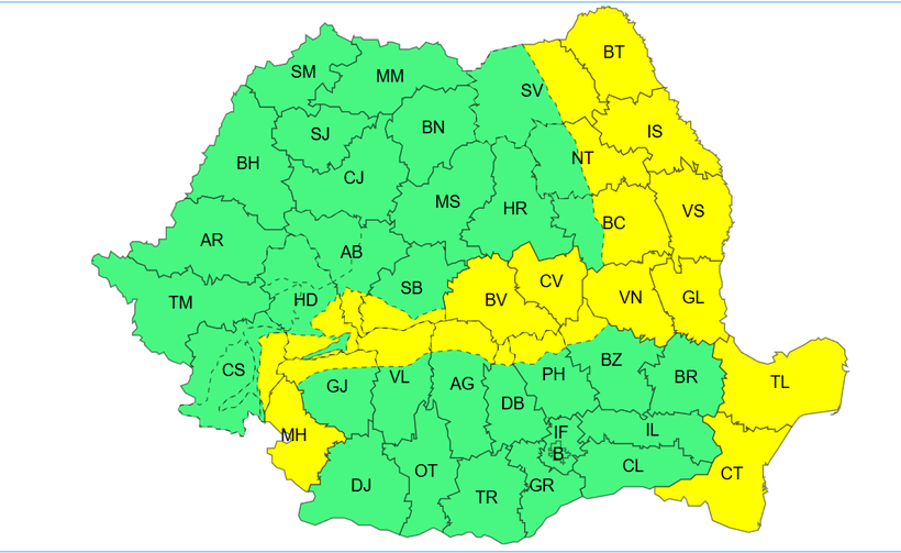 Avertizarea este valabilă până vineri, 10 octombrie, la ora 23.00. În același timp, a fost emis și un cod galben pentru Moldova, Dobrogea, sud-estul Transilvaniei și vestul Olteniei, valabil până la ora 18.00, unde vântul va sufla cu viteze de 50–60 km/h, iar izolat poate atinge 70 km/h.