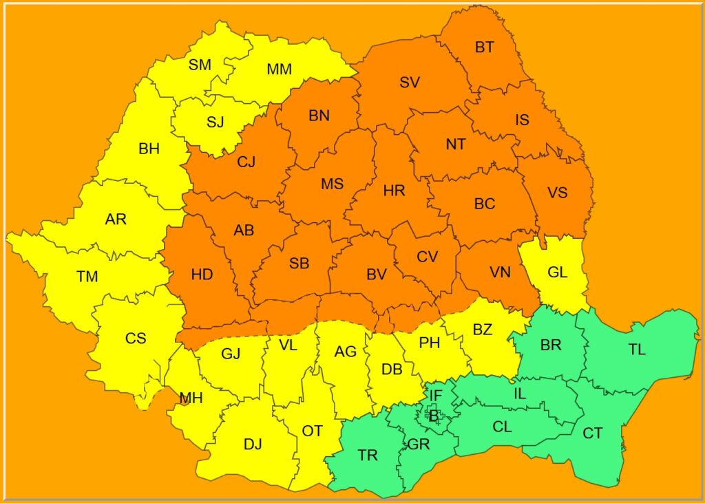 În intervalul 27 iunie, ora 12:00 – 27 iunie, ora 19:00, intră în vigoare o avertizare cod portocaliu de instabilitate atmosferică accentuată pentru Transilvania, Moldova și zonele montane.